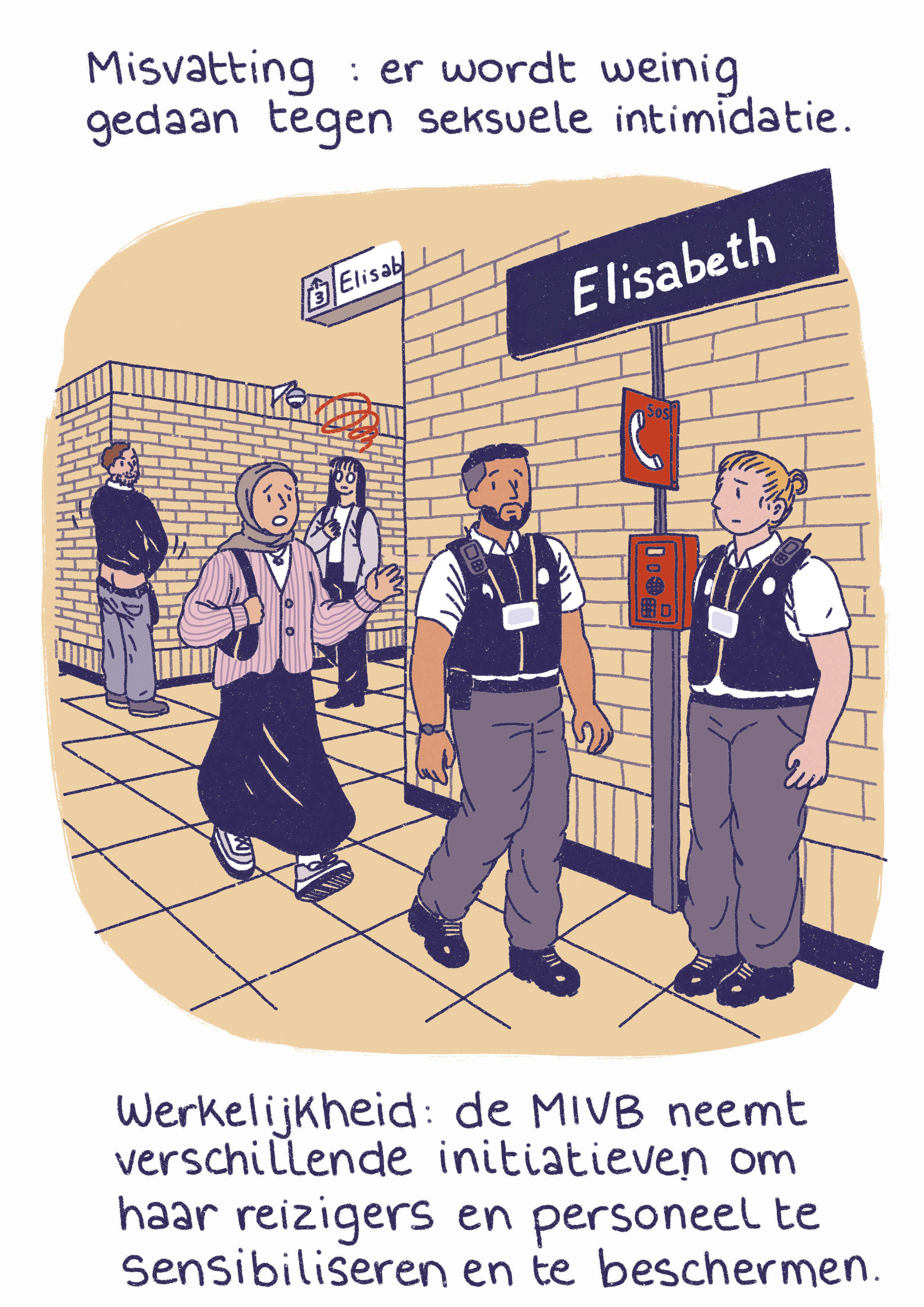 - Een rechtstreekse oproep naar de veiligheidsdiensten van de MIVB in alle voertuigen via de chauffeurs of via onze medewerkers in de stations.